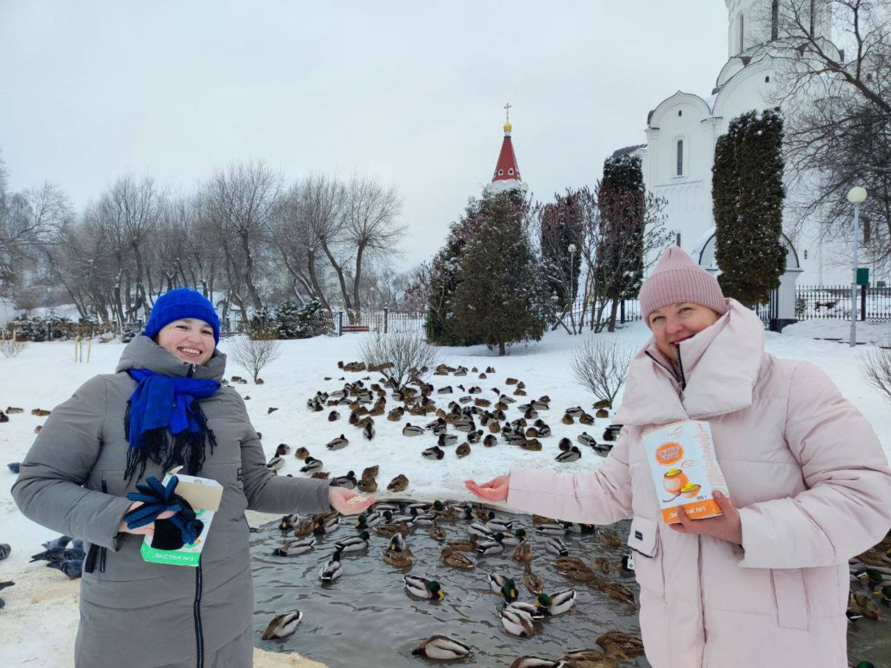 К храму Покрова Пресвятой Богородицы в Минске участницы акции привезли корм, установили кормушки и покормили птиц. Запасы корма оставили в храме.