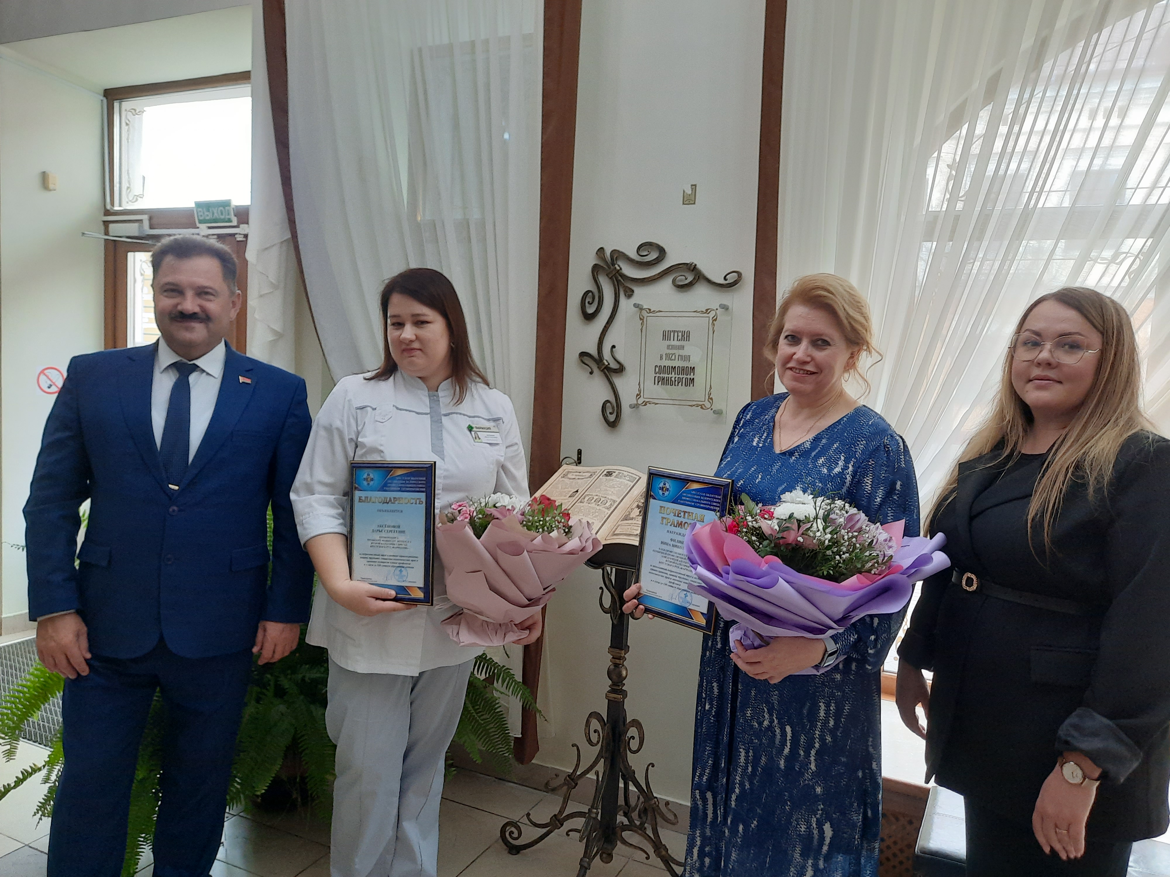 Николай Скаскевич отметил сохранившуюся традицию проведения мероприятий, посвященных юбилейным датам, с приглашением бывших работников предприятия. Вручил Почетную грамоту Брестской областной организации Белорусского профсоюза работников здравоохранения Инне Филипук и Благодарность – провизору-рецептару аптеки Дарье Аксеновой.