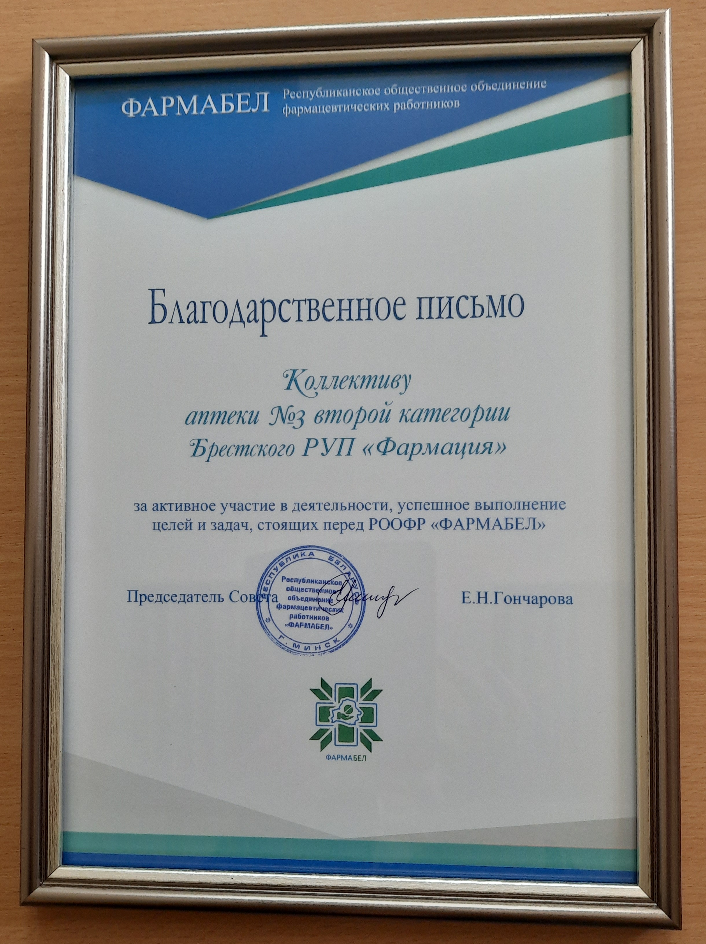 Марина Куличик, заместитель генерального директора, председатель Брестского областного правления РООФР «ФАРМАБЕЛ» от имени председателя Совета РООФР «ФАРМАБЕЛ» Елены Гончаровой и всех членов Совета поздравила коллектив аптеки № 3 и вручила Благодарственное письмо РООФР «ФАРМАБЕЛ» с сертификатом.