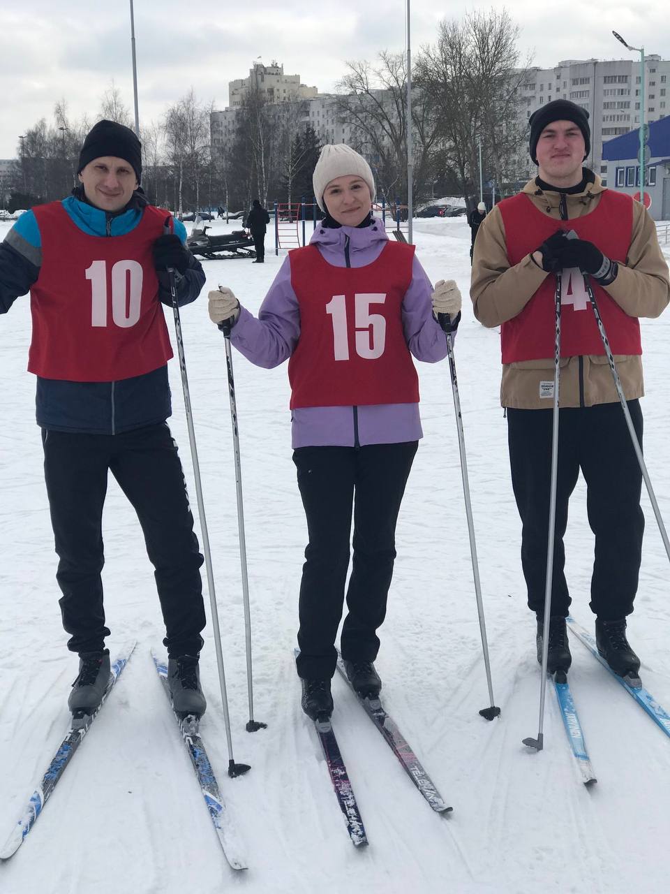 На лыжню вышли спортсмены-любители нашего предприятия: Александр Букштынов - рабочий по комплексному обслуживанию зданий и сооружений, Наталья Горелько - эколог, Алексей Климович - заведующий аптекой №42, Екатерина Бондарева - заведующий аптекой №68, Максим Шелков - провизор-рецептар аптеки №101, Данила Коростик - химик, КАЛ.