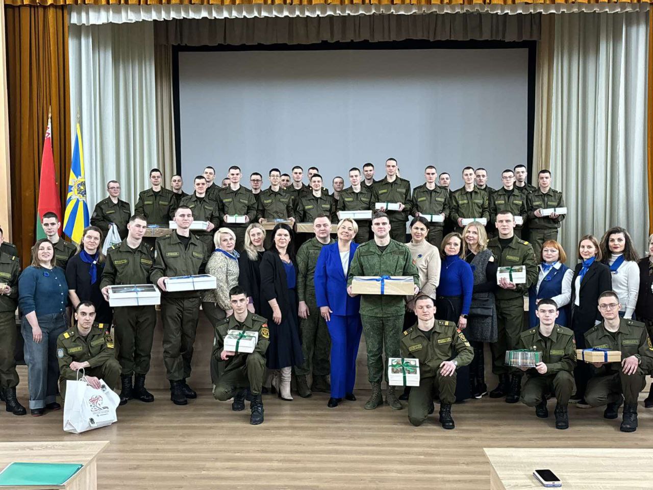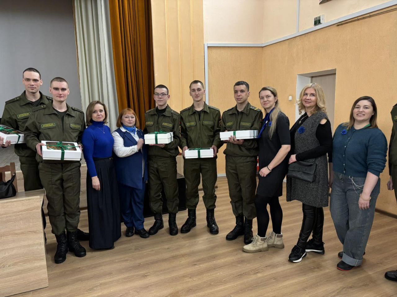 В День защитника Отечества и Вооруженных Сил Республики Беларусь представительницы ПО ОО «Белорусский союз женщин» и «Белая Русь» РУП «БЕЛФАРМАЦИЯ» продолжили традиционную акцию «Мамины пироги» и отправились с поздравлениями и вкусными подарками в в/ч 45017.