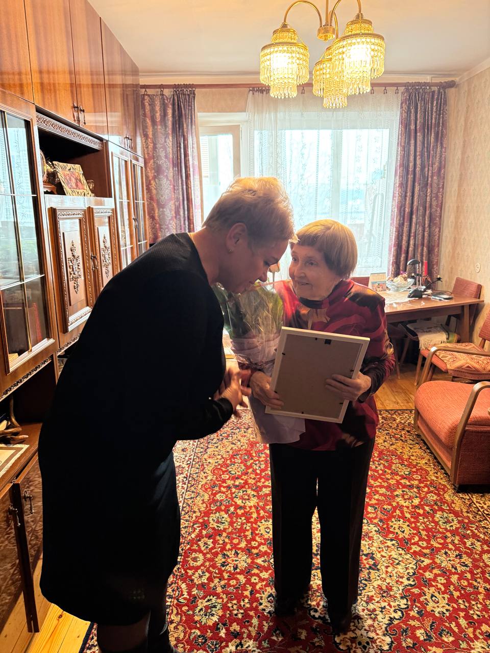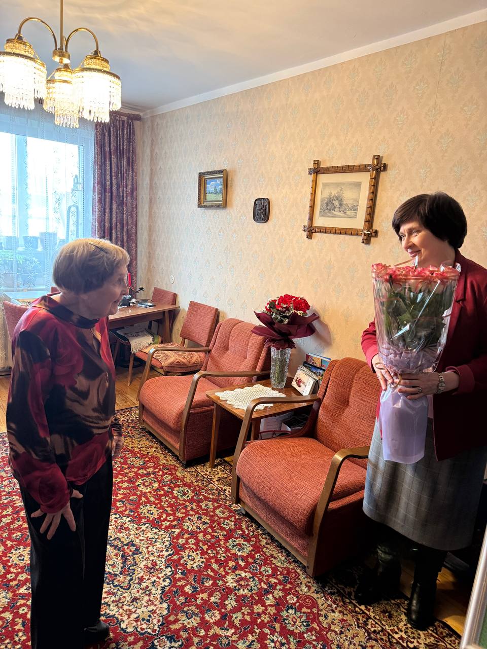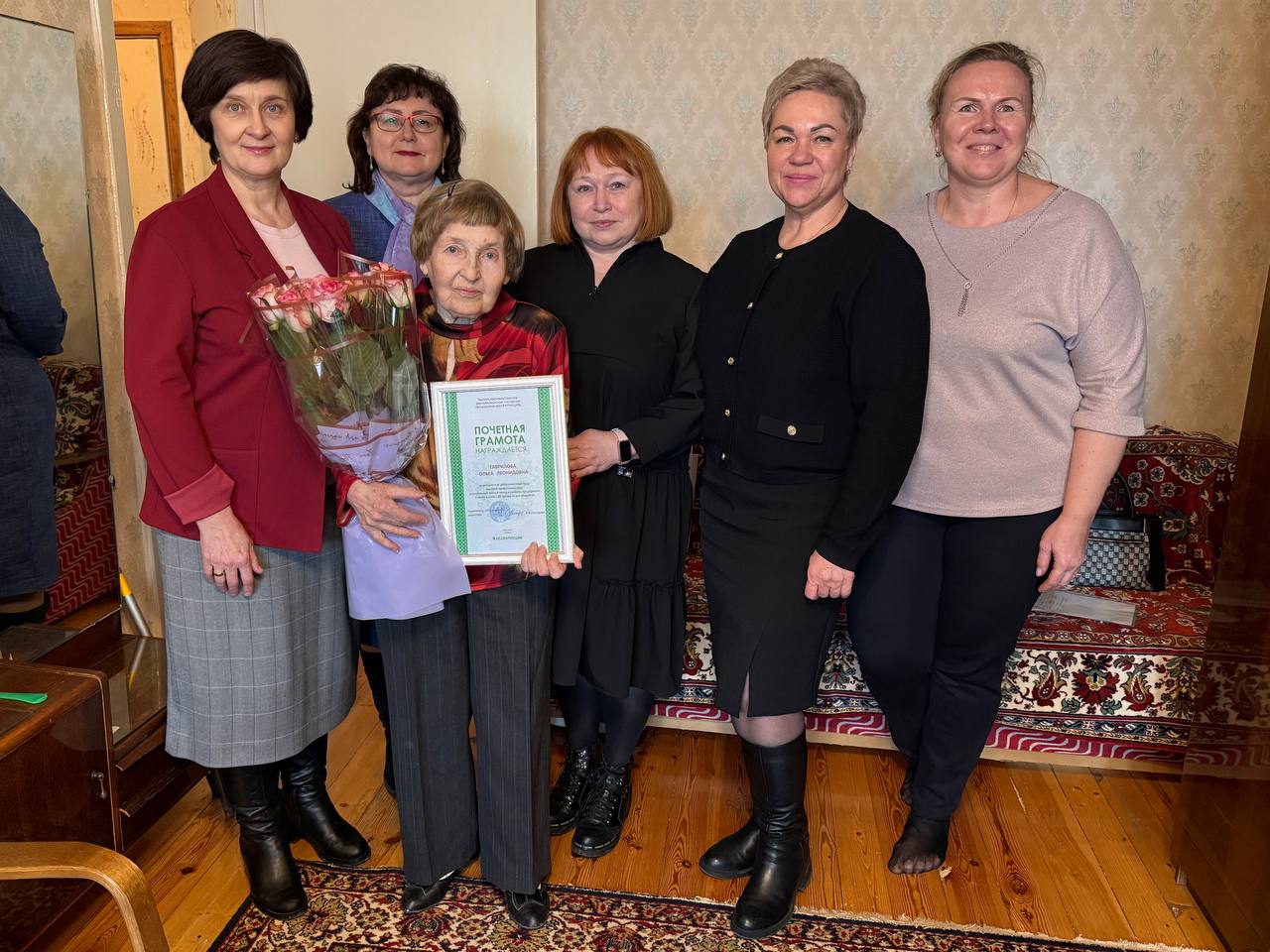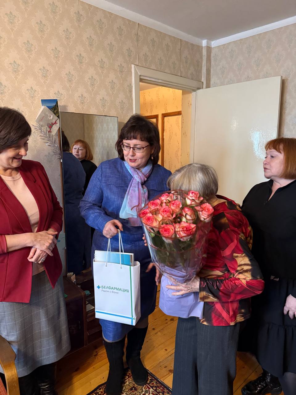 Руководство предприятия, аптеки №13, коллеги, представители общественных объединений «ФАРМАБЕЛ», «Белорусский союз женщин» и профсоюзной организации предприятия приехали к Ольге Леонидовне домой, вручили цветы и подарки и тепло поздравили её с юбилеем.