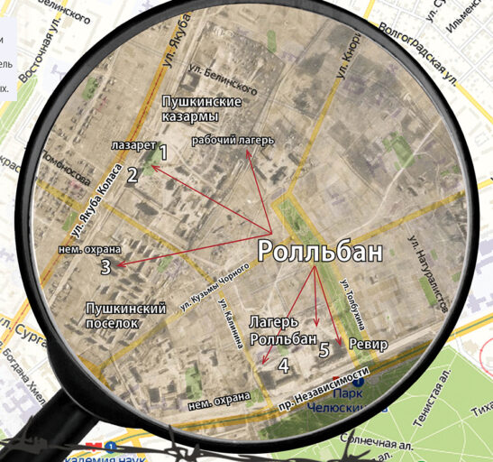 Городская часть лагеря Ролльбан (Пушкинские казармы в бывшем военном городке в границах нынешних улиц Калинина, Я. Коласа, Белинского и К.Чорного).